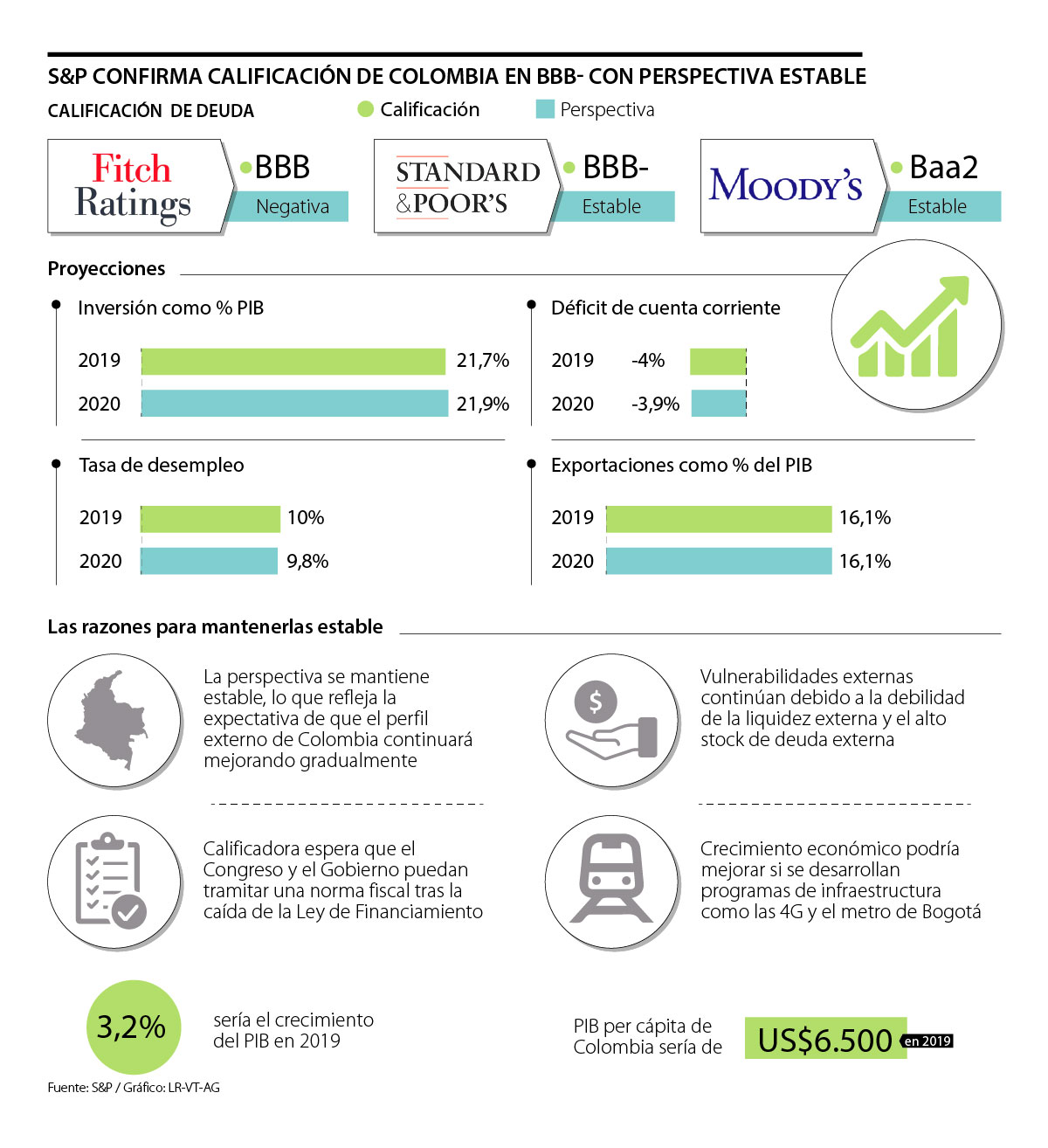 La agencia Standard & Poor’s ratificó ayer la calificación de Colombia en BBB- con perspectiva estable. La decisión se dio luego de que la firma estableciera que el perfil continuará mejorando no solo como resultado de una mayor inversión extranjera, sino también por un crecimiento en el PIB de 3,2% y una mejor gestión del gasto. Sin embargo, alertó por el efecto de las debilidades externas.