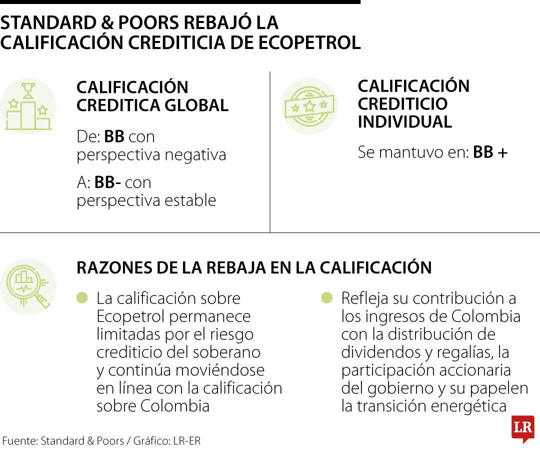 Luego de la rebaja de la calificación crediticia global de Standard & Poors a Colombia en la jornada del miércoles, la estatal Ecopetrol corrió con la misma suerte y sufrió un ajuste en la calificación, de BB a BB-. El perfil crediticio individual fue mantenido en bb+.