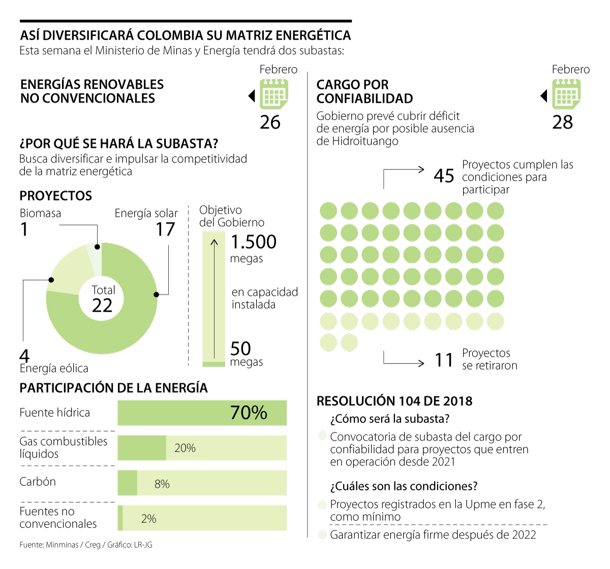 Se trata de la subasta de energías renovables no convencionales de mañana y la del cargo por confiabilidad del jueves de esta semana. La primera se centrará en poner contratos de energía solar y eólica a futuro, mientras que la segunda asignará responsabilidades para cubrir el posible déficit que se presentaría en dos años.
