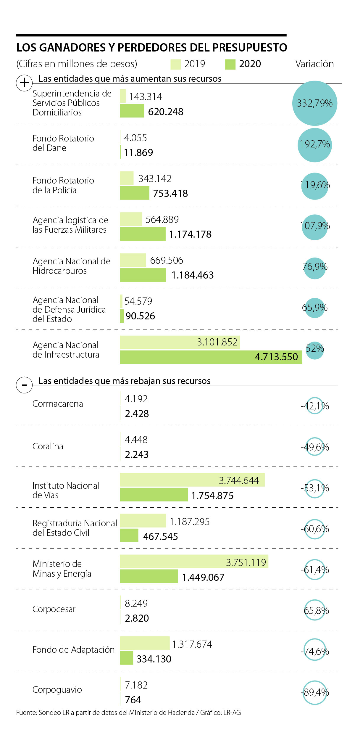 A falta de iniciar la discusión en el Legislativo, la entidad más beneficiada es por el momento la Superintendencia de Servicios Públicos Domiciliarios (Superservicios), que pasó de tener recursos de $143.314 millones este año a contar con $620.248 millones para 2020, lo que representa un alza de 332,79%. El Fondo Rotatorio del Dane (Fondane) es el segundo que más gana, puesto que contará con recursos de $11.869 millones para el próximo año (+192,7%), seguido del Fondo Rotatorio de la Policía (Forpo) al llegar hasta $753.418 millones (+119,6%).