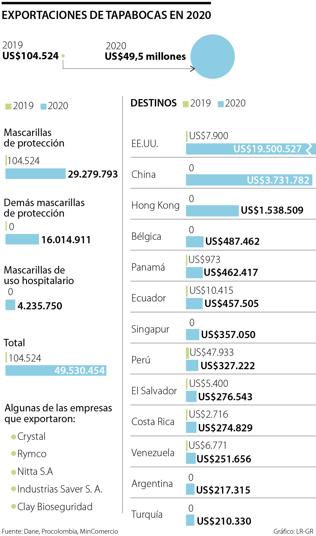 En este sentido, los países que más compraron tapabocas el año pasado fueron: Estados Unidos con US$19 millones (en 2019 compró apenas US$7.900); China con US$3,7 millones; Hong Kong con US$1,5 millones y Bélgica con US$487.462. Antes de la pandemia, estos últimos tres países no habían reportado compras a Colombia de mascarillas de protección.