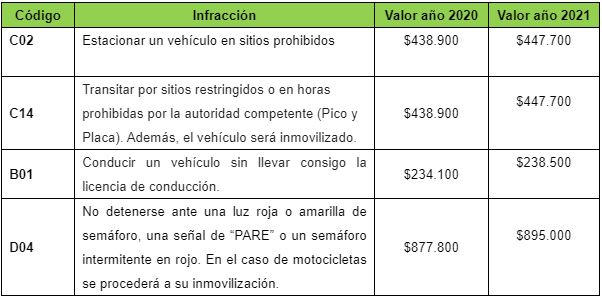 Los nuevos costos también aplican para el parqueadero y grúa en caso de que los vehículos sean inmovilizados por no cumplir las normas de tránsito. Con el nuevo Salario Mínimo Legal Mensual para 2021, $908.526, las tarifas quedaron así:
