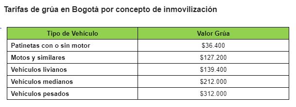 Adicionalmente, anunció cómo quedarán las tarifas de grúa en Bogotá por concepto de inmovilización: