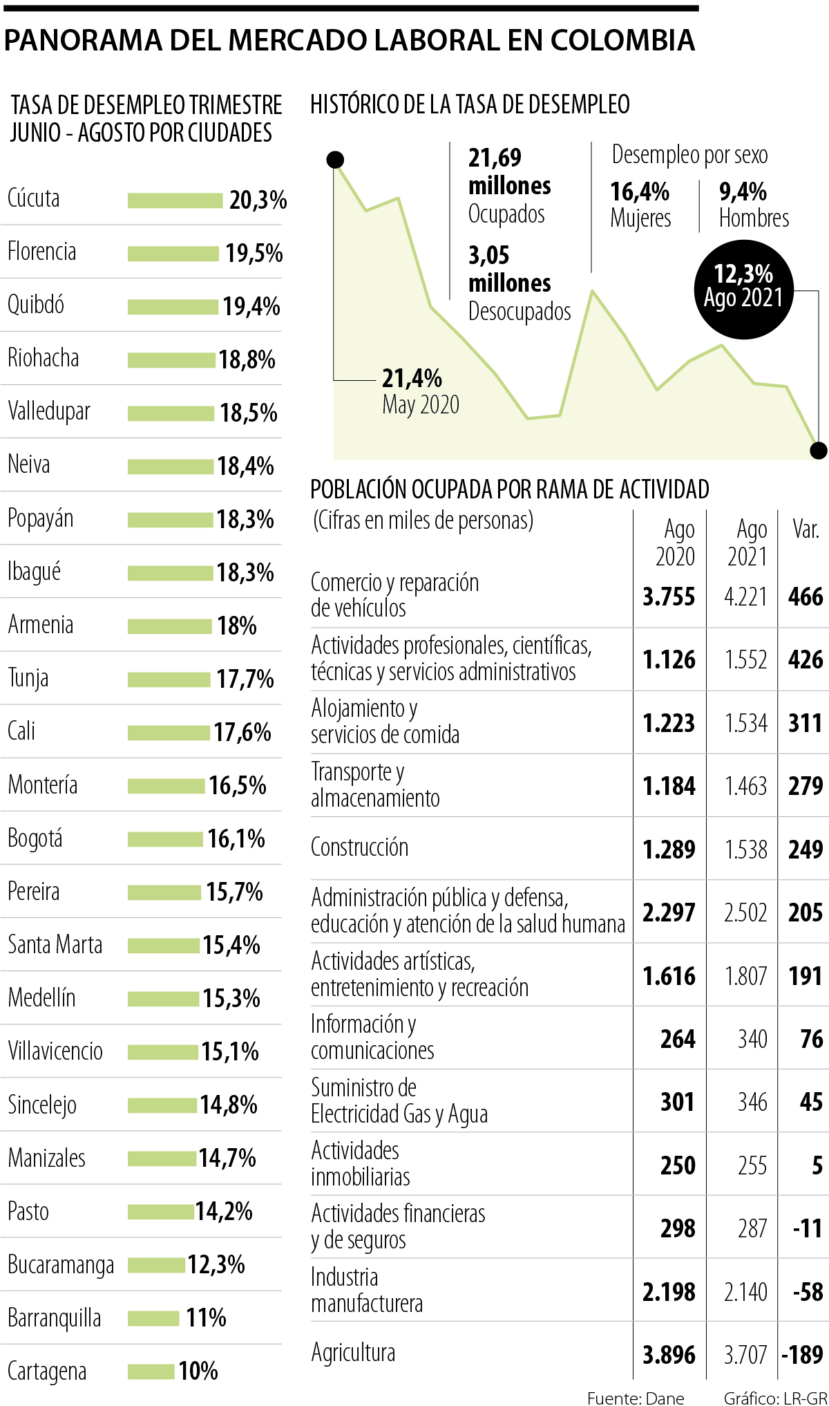 En la desagregación por las principales ciudades, en agosto Cali fue la que registró la cifra de desempleo más alta, con una tasa de 16,3%. Seguido estuvieron Medellín (14,8%), Bogotá (14,4%), Bucaramanga (11,1%) y Barranquilla (10,2%). Mientras que, en la medición del trimestre de junio a agosto, la tasa de desempleo cayó en la totalidad de las 23 ciudades del país, siendo Cartagena la ciudad con la menor cifra (10%).