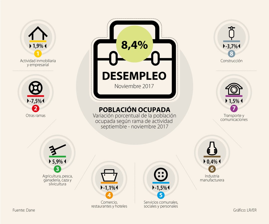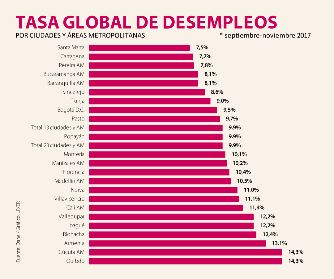 El Departamento Administrativo Nacional de Estadística (Dane) dio a conocer que la tasa de desempleo en el país se ubicó en 8,4%, con un incremento de 0,9 puntos porcentuales frente a la tasa registrada en noviembre de 2016, que fue de 7,5%.