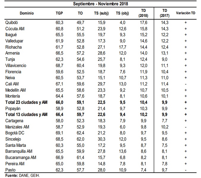 Si se mira el desempleo por ciudad, las que registraron las mayores tasas fueron Quibdó, con 17,6%; Cúcuta, con 15,8%; Ibagué, con 15,2%; Valledupar, con 14,6%; y Riohacha, con 14,4%. Por el contrario, las capitales con las menores tasas de desempleo fueron Pasto, con 7,4%; Pereira, con 8,1%;