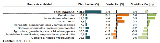 "La mayor contribución a la variación de la población ocupada se dio en los sectores construcción; industria manufacturera; y otras ramas, estas contribuyeron en conjunto con 1,3 puntos porcentuales. Entre tanto, la rama de comercio, hoteles y restaurantes restó 0,6 puntos porcentuales", señaló el Dane en su boletín técnico.