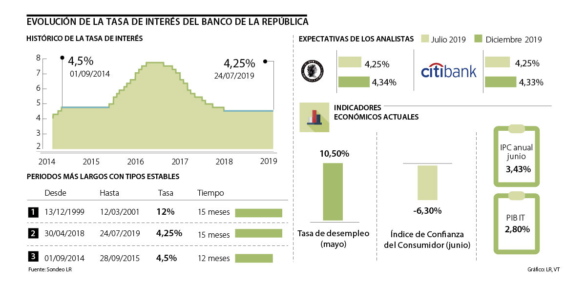 El aumento de las expectativas de inflación sumado a un crecimiento moderado de la economía llevaría a la Junta Directiva del Banco de la República, que se reúne hoy por séptima vez en el año, a mantener estable la tasa de interés en 4,25%. Con esta decisión, el Emisor completaría 15 meses en ese nivel y este se convertiría en el periodo más largo en el que las tasas han estado estables al empatar, con lo ocurrido entre diciembre de 1999 y marzo de 2001 en el que estuvieron un año y tres meses en 12%.