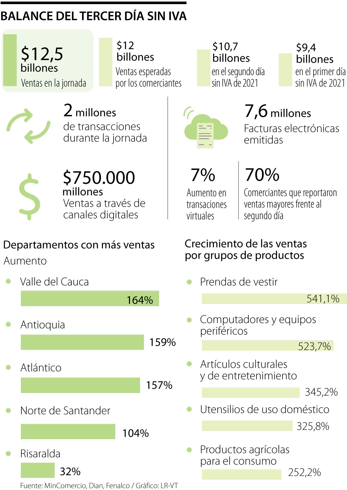 La tercera y última jornada del Día sin IVA de este año dejó ventas por encima de los $12 billones, cifra récord comparada con las evidenciadas en la primera y la segunda jornada, donde el resultado fue de $9,4 billones y $10,7 billones, respectivamente.