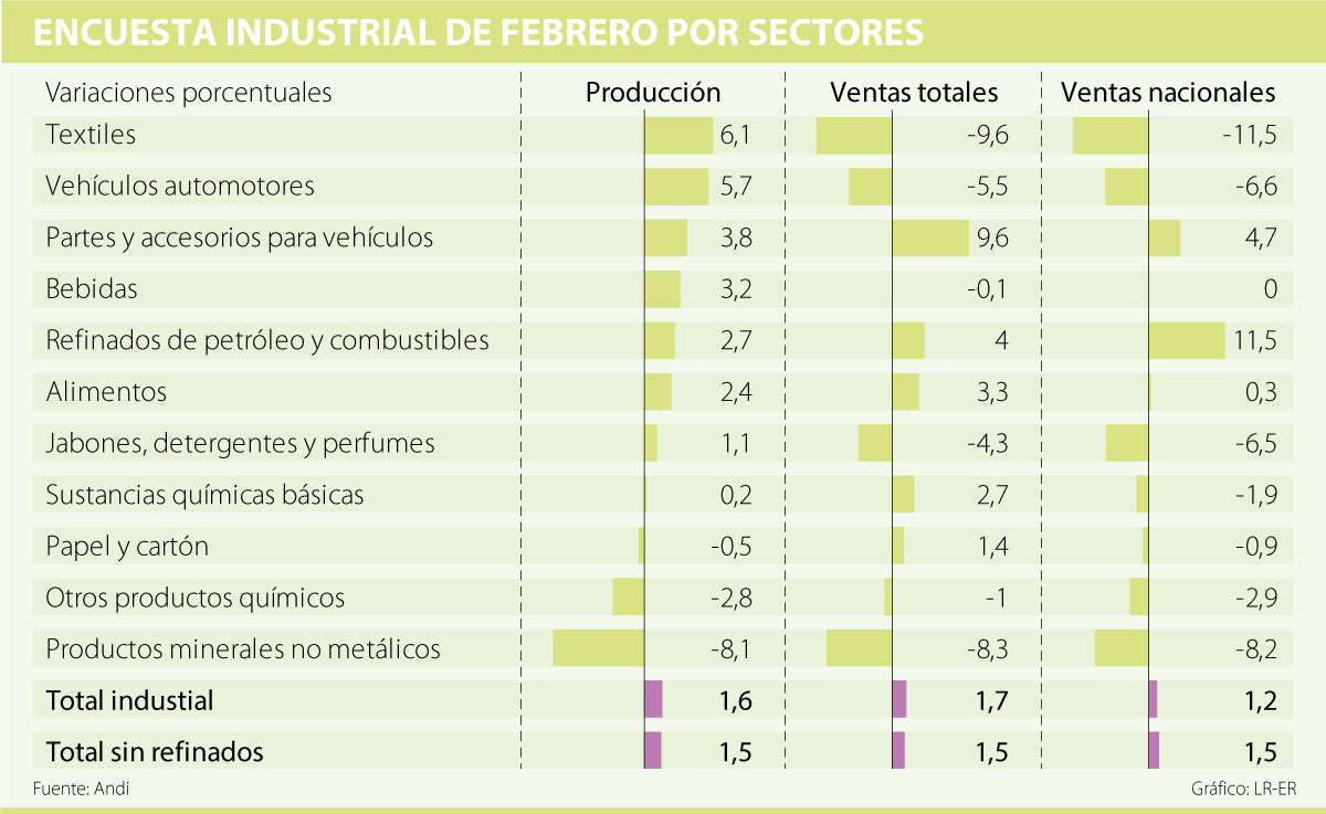 En la otra cara de la moneda se ubican los sectores suya industria decreció en el primer bimestre del año. El más afectado fue el de los productos minerales no metálicos, cuya producción cayó en 8,1%, sus ventas totales en 8,3% y sus ventas nacionales en 8,2%. A “Otros productos químicos”, sector que no contempla las sustancias básicas tampoco le fue bien. Las ventas totales y nacionales descendieron en 1% y 2,9% y su producción también decreció 2,8%.