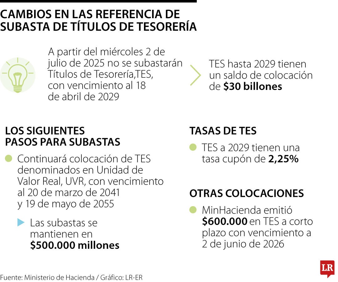 El Ministerio de Hacienda anunció cambios en las referencias de las subastas de los Títulos de Tesorería, TES, denominados en Unidades de Valor Real, UVR. A partir del 2 de julio de 2025, se suspenderán las subastas de los TES con vencimiento el 18 de abril de 2029. La cartera también informó que los TES denominados en UVR con vencimiento en 2029 tienen saldos de colocación que alcanzan $30 billones.