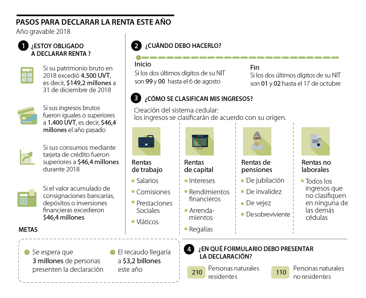 Desde el pasado martes 6 de agosto hasta el próximo 17 de octubre se vencerán las fechas máximas establecidas para que las más de tres millones de personas naturales obligadas a declarar presenten ante la Dian su formulario correspondiente al año gravable 2018: el 210 si es residente y el 110 si no lo es.