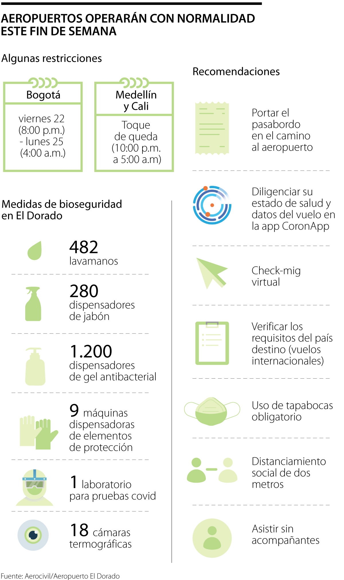 No obstante, todas las autoridades aeroportuarias y de transporte (Aerocivil, Migración Colombia, Ministerio de Transporte y Superintendencia de Transporte) concuerdan en las principales recomendaciones de operabilidad y bioseguridad a la hora de tomar vuelos nacionales e internacionales.