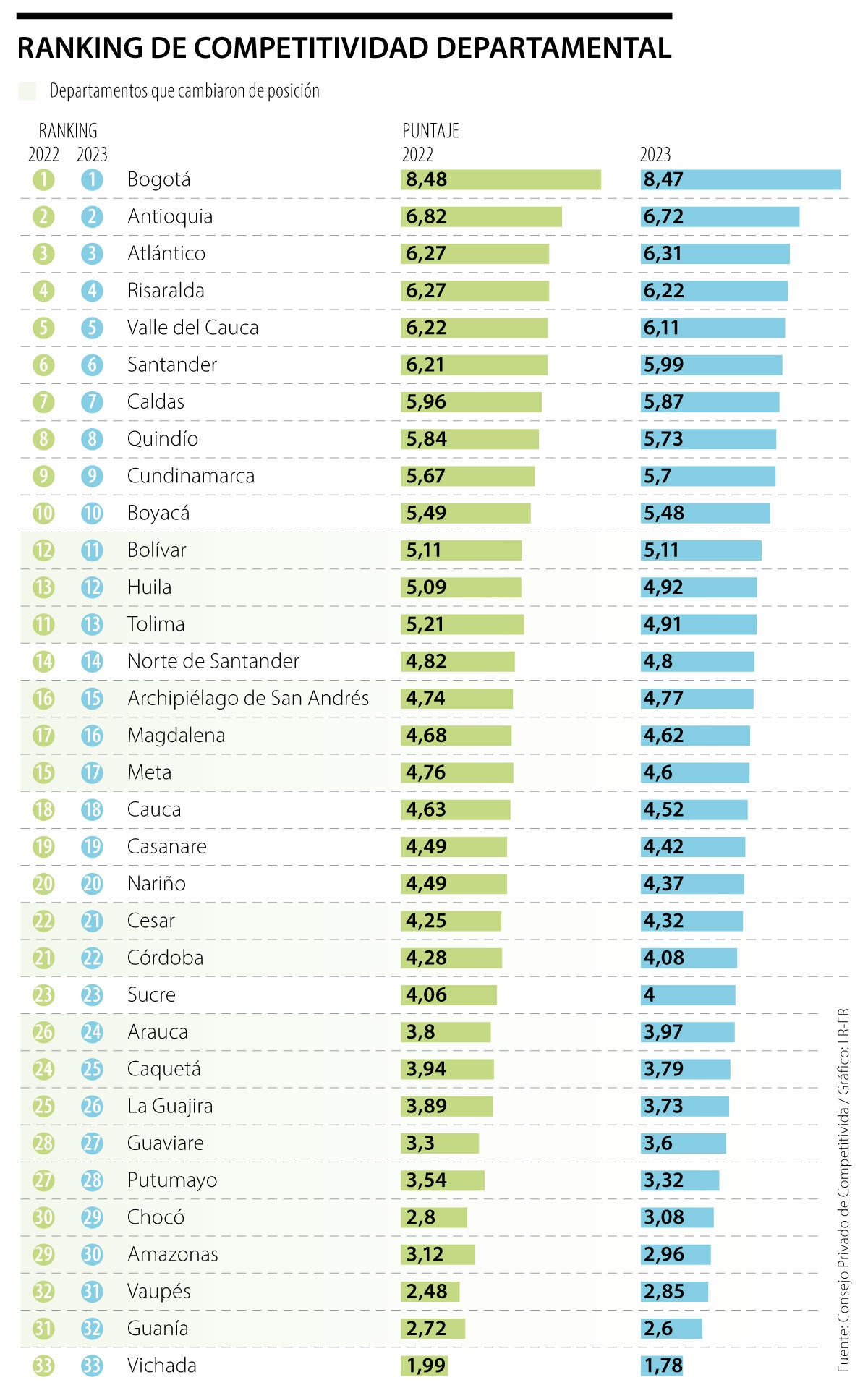 En el análisis, ocho departamentos registraron una caída en su posición. En el caso de Tolima y Meta, perdieron dos puestos cada uno, mientras que Córdoba, Caquetá, La Guajira, Putumayo, Amazonas, y Guainía descendieron un puesto.