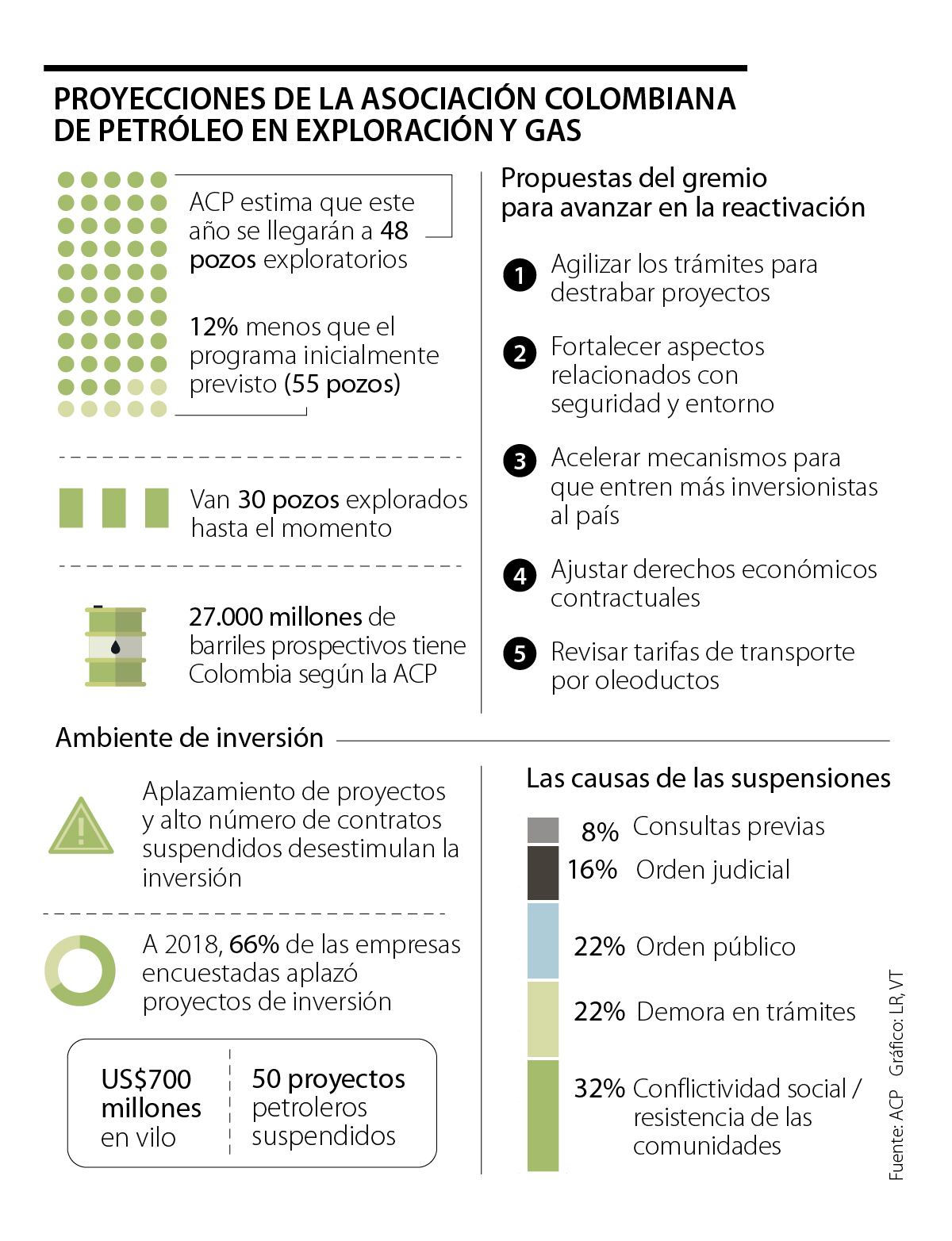 El estudio, realizado por la Asociación Colombiana de Petróleo (ACP), reveló que este alto número de proyectos suspendidos representan inversiones por hasta US$700 millones. Según el gremio, dicha cifra está congelada por variables externas que afectan el entorno de las empresas.