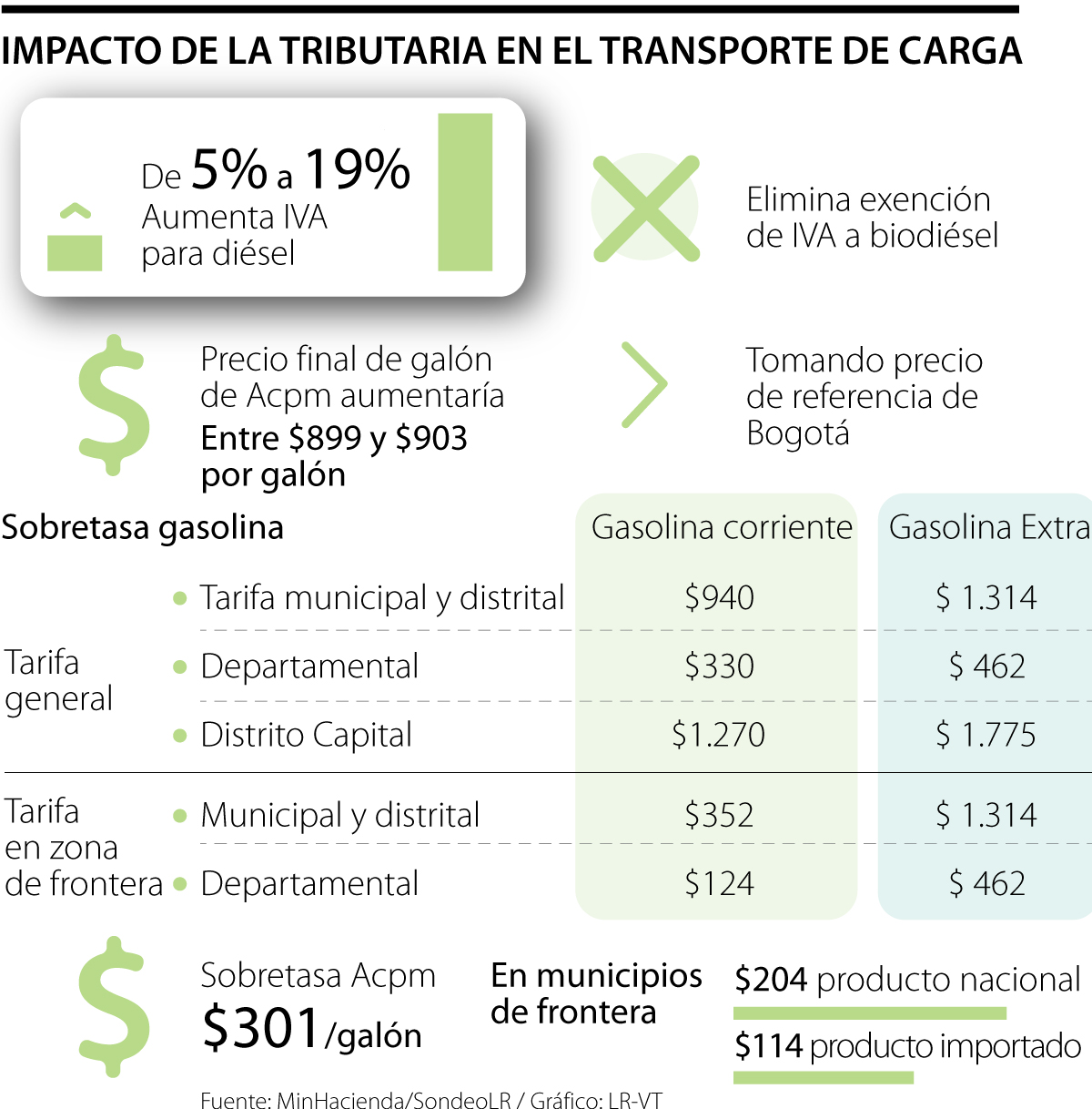 “Hoy por cada galón de combustible que compramos debemos pagar de su valor 23% en impuestos, con esta reforma pasaremos a pagar 30%; el aumento final por galón de Acpm será de $903”, señaló el presidente de Fedetranscarga, Henry Cárdenas. Cabe anotar que, según cálculos de Colfecar, este aumento sería de $899 por galón.