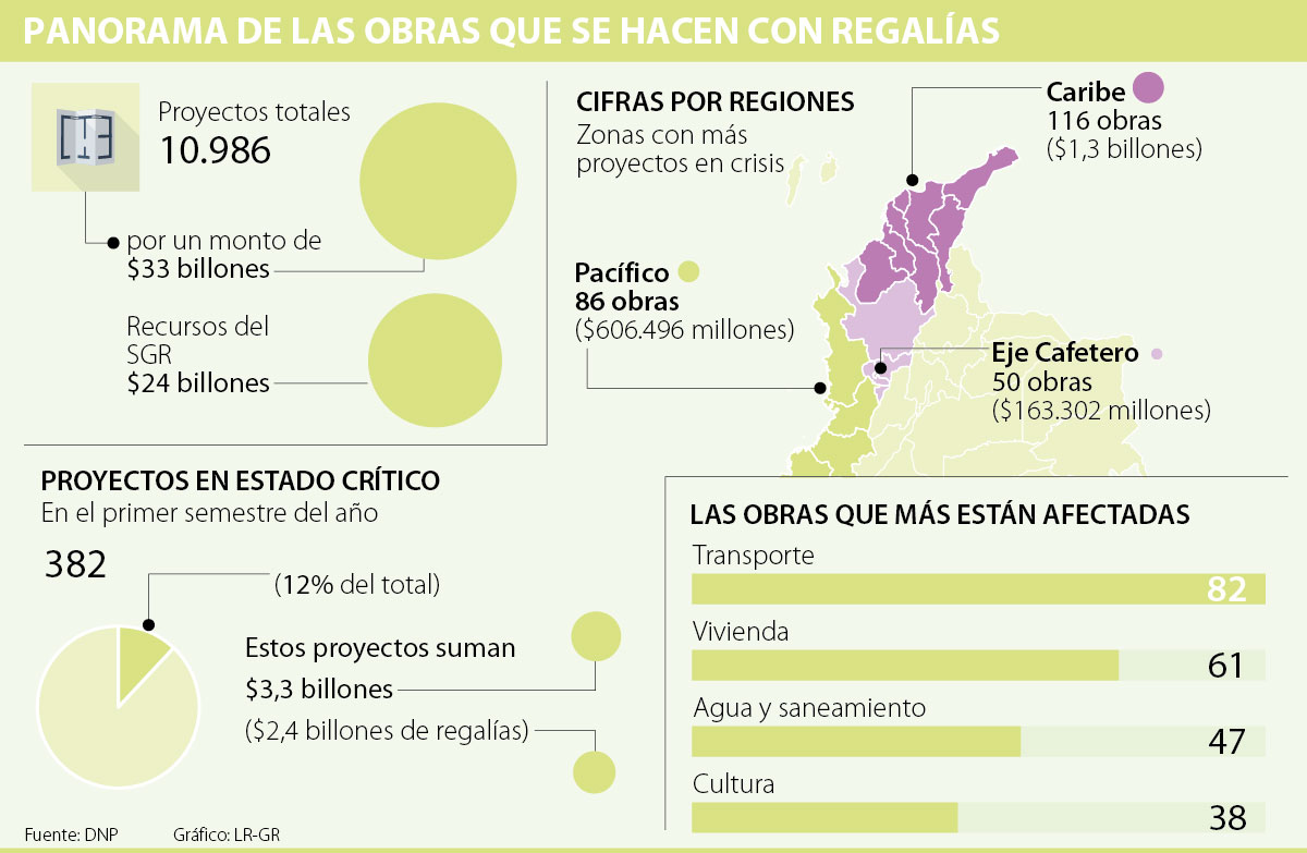 Aunque las cifras son variadas, del total de 382 proyectos con problemas, el Departamento Nacional de Planeación identificó que la región donde se concentra el mayor número es el Caribe, que tiene 116 obras con problemas, por un monto de $1,3 billones. La zona del Pacífico concentró 86 proyectos críticos, los cuales suman un total de $606.496 millones, junto con el Eje Cafetero, donde hay 50 obras con problemas. Luis Fernando Mejía, director del DNP, dijo que no hay ningún factor de capacidad institucional que determine que el Caribe tenga el mayor número de dificultades.
