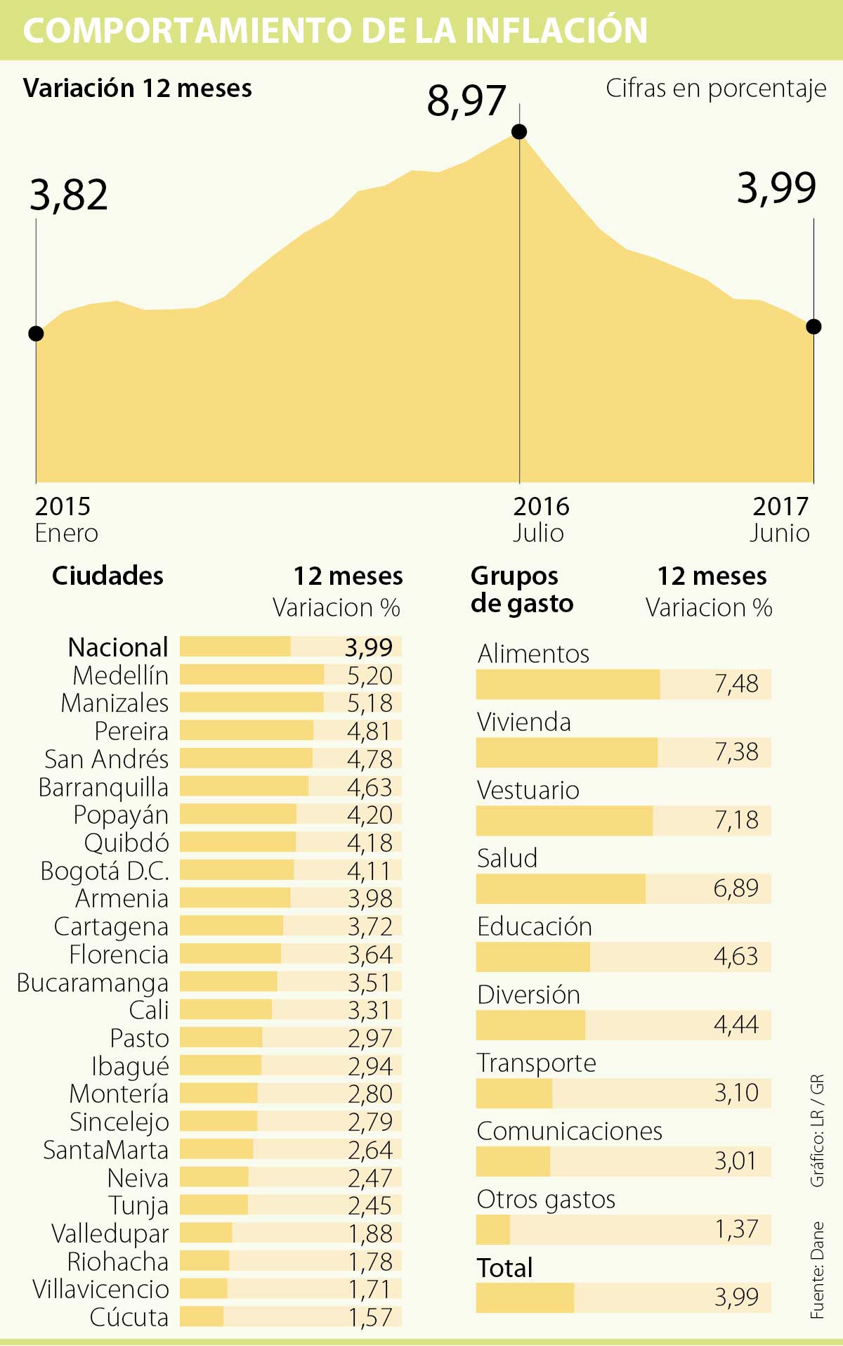 En cuanto a las ciudades, Medellín, Manizales y Pereira fueron las que más aumentaron el costo de vida en el último año, con variaciones de (5,20%), (5,18%) y (4,81%), respectivamente. Por debajo del promedio se situaron Armenia (con 3,98%), Cartagena (3,72%) y Florencia (3,64%).