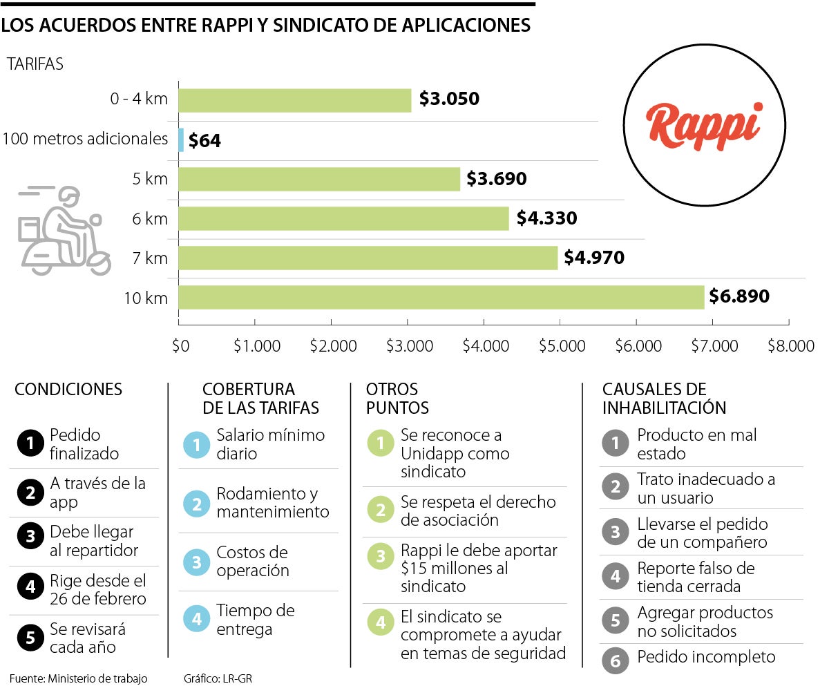 Además de la tarifa mínima, otros de los puntos a los que se llegó a un consenso es que, al reconocerse a Unidapp como sindicato, se le respetará el derecho de asociación y Rappi le deberá aportar $15 millones.