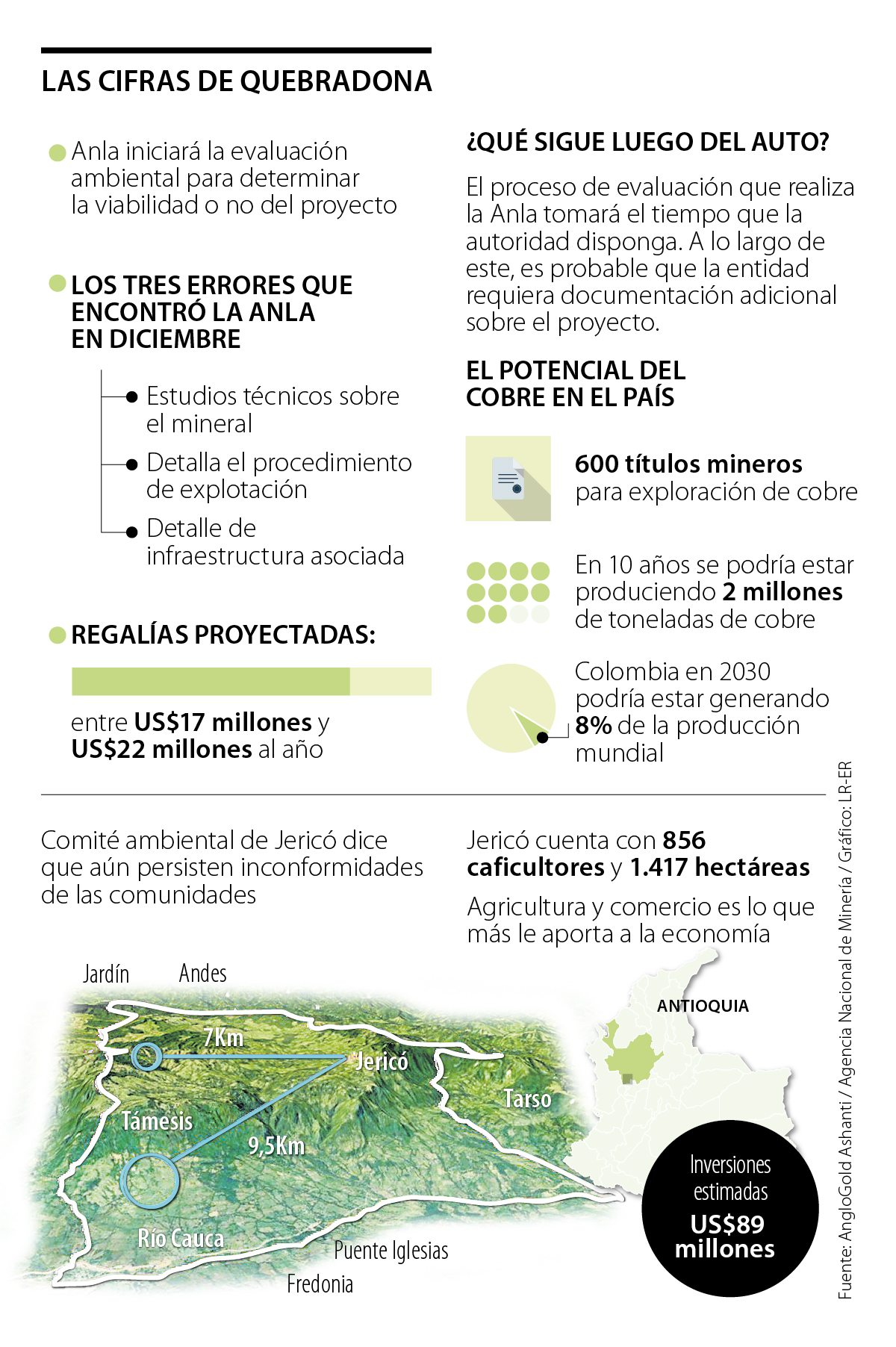 La emisión de este acto administrativo deja ver, según AngloGold Ashanti, que se cumplieron todos los requisitos que se exigieron en el EIA. Si bien es tan solo el primer paso, lo cierto es que ahora el proyecto pasará a estudio para evaluar si se le otorga o no la licencia ambiental. En este proceso la Anla estudiará todos los aspectos de la mina de cobre, por lo que aún quedan surtir varios trámites para que inicie su operación formal.