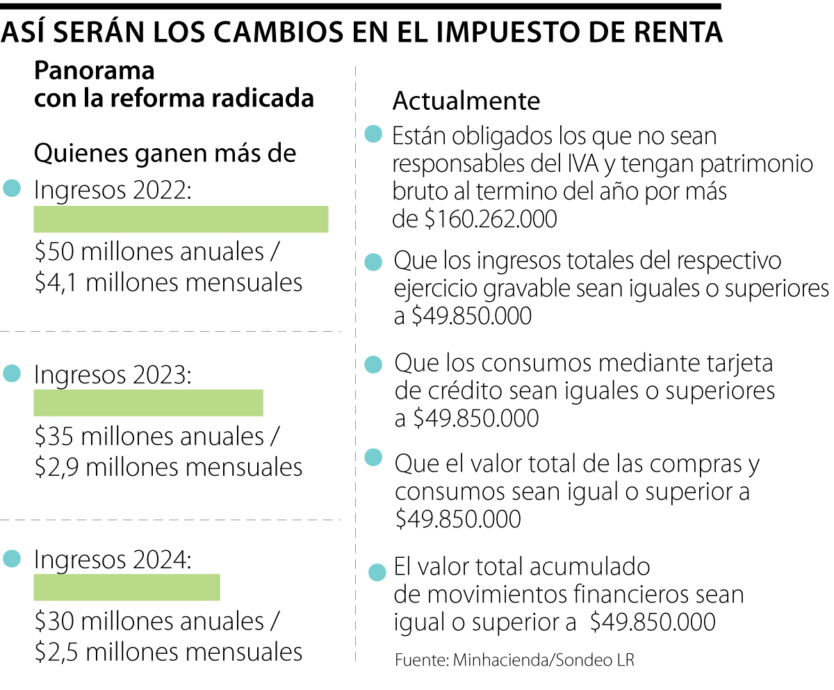 Pues, para los ingresos de 2022, solo pagarían renta los asalariados que ganen más de $50 millones anuales ($4,1 millones promedio mensuales). En 2023, únicamente los asalariados con ingresos superiores a $35 millones anuales ($2,9 millones promedio mensuales) mientras que para 2024, quienes tengan ingresos superiores a $30 millones ($2,5 millones al mes).