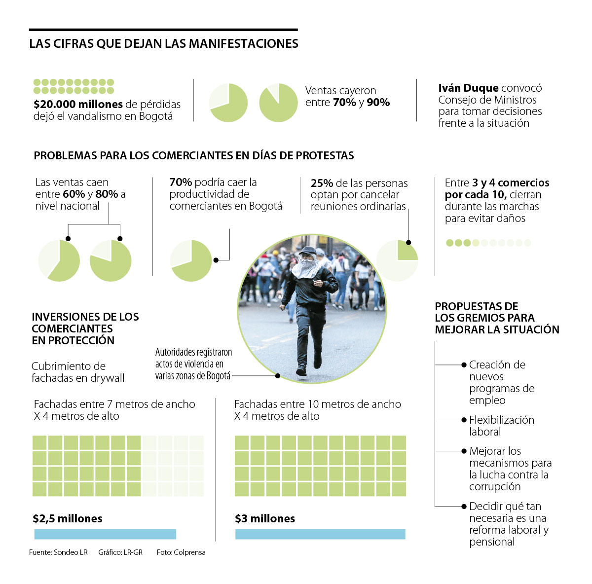 Desde el jueves las ventas en el comercio ya se habían visto afectadas. Según el balance de Fenalco-Bogotá, cerca de 90% de los negocios ubicados en el centro de Bogotá cerraron sus puertas. Los cálculos oficiales del gremio indicaban que las ventas cayeron entre 70% y 90%, siendo La Candelaria, Santa Fe, Engativá y Suba las localidades más afectadas.