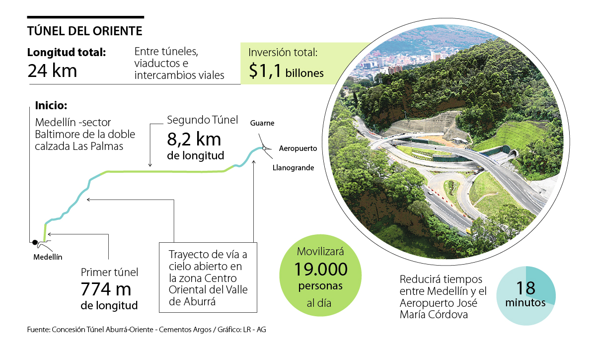 La construcción, que inicia en Medellín en el sector Baltimore de la doble calzada Las Palmas, cuenta con dos túneles, uno de 774 metros y otro de 8,2 km. de longitud, y facilitará la movilidad de cerca de 19.000 personas al día entre la capital antioqueña y el Aeropuerto Internacional José María Córdova.