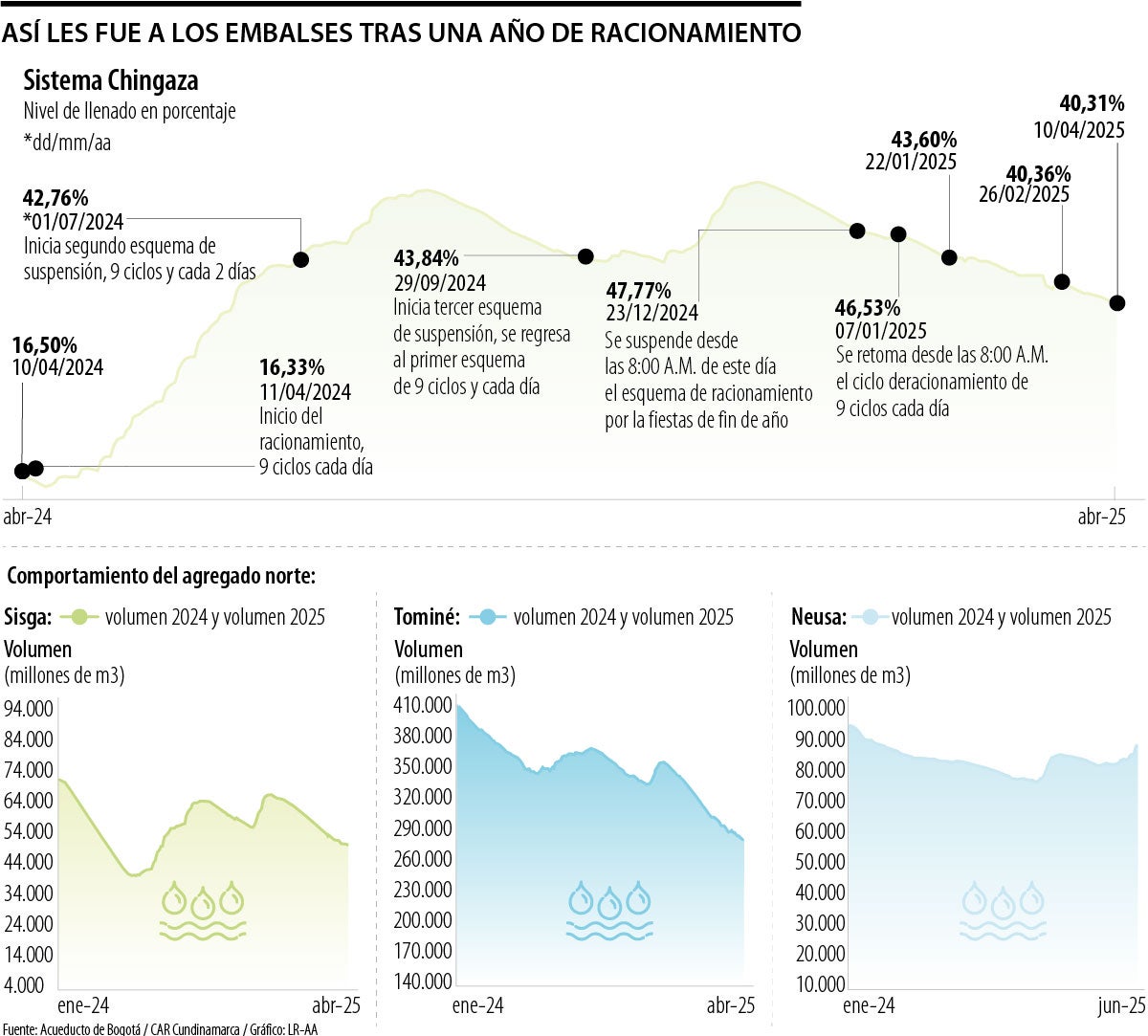 Según los reportes de la CAR Cundinamarca, con corte a 10 de abril, Chingaza ha tenido una tendencia ascendente desde el cinco de abril, cuando se encontraba en 39,90%, aumentando 0,41 puntos. Con respecto al agregado sur, que comprende los embalses de Chisacá y Regadera, mostró un nivel de llenado de 99,99%, en el último reporte.