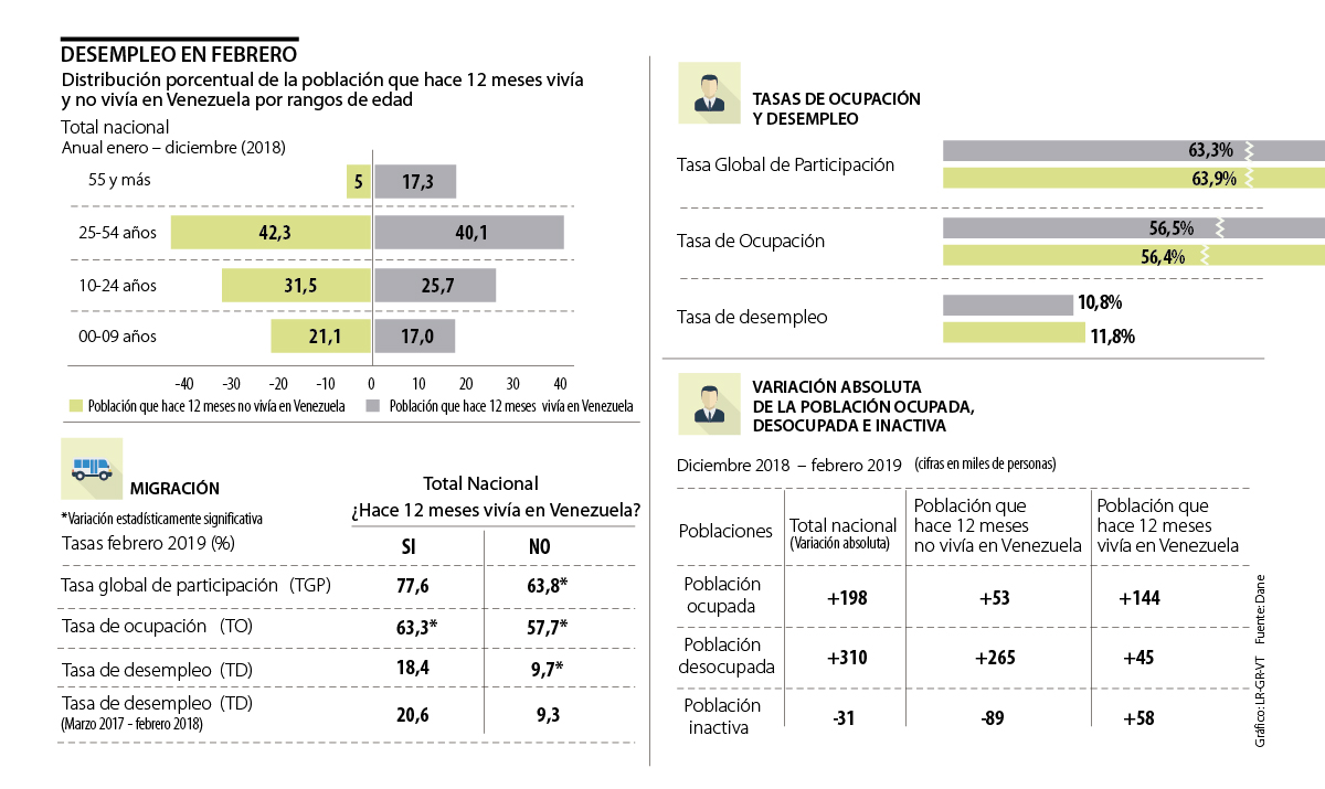 Precisamente, cuando se aplica el filtro de si la persona encuestada vivía en Venezuela hace 12 meses, el director del Dane explicó que la tasa de desempleo superó 18%, mientras que la de los nacionales apenas llegó a 9,7%. Sin embargo, en el trimestre anterior, la cifra del desempleo de los migrantes superaba 20%, mientras que la de los nacionales era de 9,3%.
