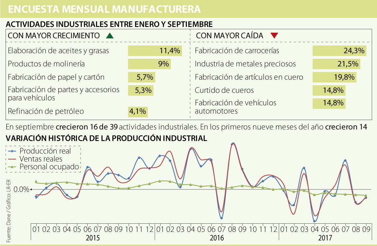 Aunque según el Departamento Administrativo Nacional de Estadística (Dane), la producción manufacturera en septiembre cayó 1,9%; las ventas, 1,8%; y 1,3% el personal ocupado en las empresas, no todo fue negativo para la actividad industrial. De 39 sectores, 16 presentaron crecimientos, seis más que en agosto.