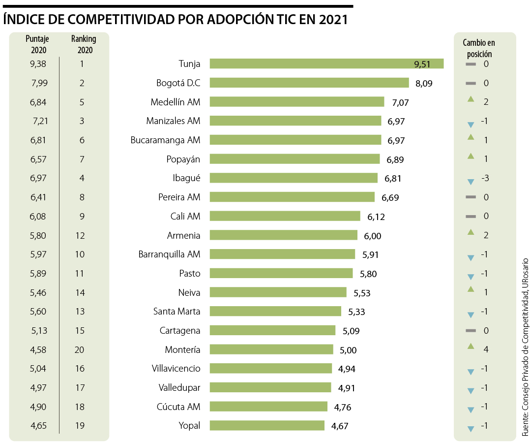 El Índice de Competitividad de Ciudades 2021 de la Universidad del Rosario y el Consejo Privado de Competitividad reveló que Tunja, Bogotá, Medellín y Manizales son las más competitivas por adopción TIC para este año.