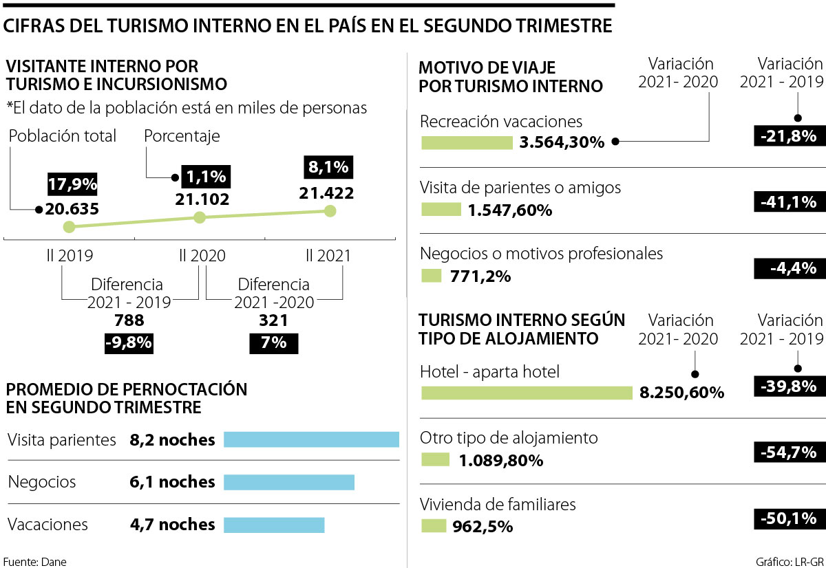 El Departamento Administrativo Nacional de Estadísticas, Dane, reveló que para el segundo trimestre del año en el total de 24 ciudades y áreas metropolitanas, 8,1% de las personas de diez años y más realizaron turismo interno y/o excursionismo, es decir, 1,7 millones de personas, lo que representó un incremento de 7,0 puntos porcentuales frente al mismo periodo del año 2020,cuando este porcentaje se había ubicado en 1,1%.