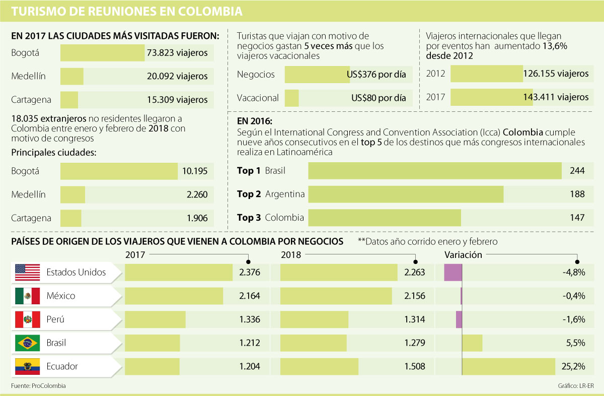 Precisamente, cada 14 de abril se celebra el día internacional del turismo de reuniones, un sector en el cual Colombia ha ido ganando terreno. De acuerdo con el International Congress and Convention Association (Icca), el país ocupó en 2016 el tercer lugar, tras Brasil y Argentina, como el principal destino de la región.