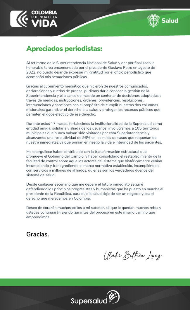 “Me enorgullece haber contribuido con la transformación estructural que promueve el Gobierno del Cambio (…) Desde cualquier escenario que me depare el futuro inmediato seguiré defendiendo los principios progresistas y humanistas que ha puesto en marcha el presidente de la República, para que la salud deje de ser un negocio y sea el derecho que merecemos en Colombia”, destacó.