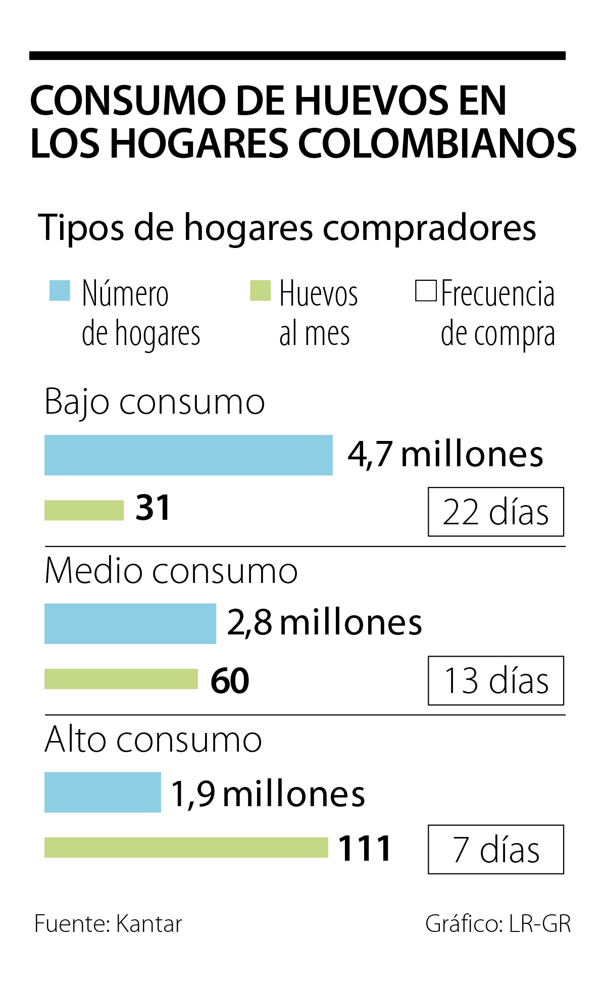 Alrededor de 20% de los hogares colombianos (1,9 millones) se puede clasificar como de alto consumo de huevos, pues mensualmente compran 111 de estos productos y su frecuencia de adquisición es siete días. La mayoría de estos están ubicados en Santander y en Bogotá.