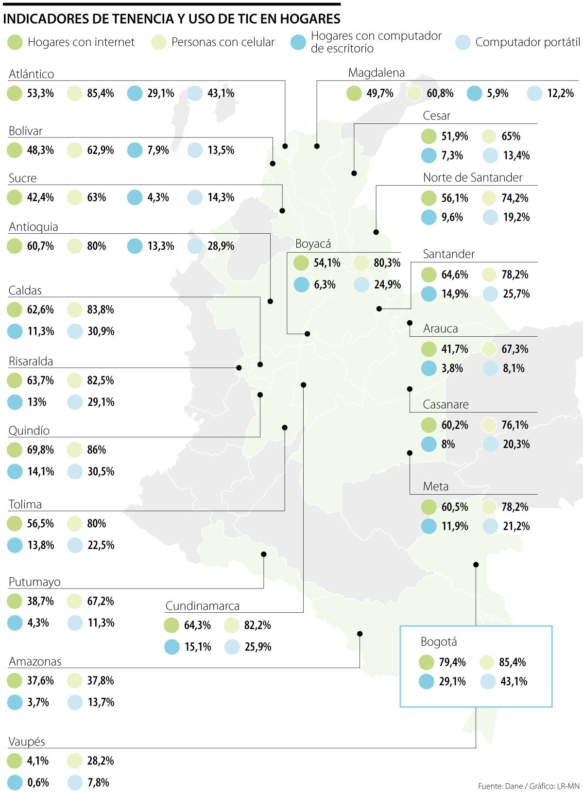 Bogotá sigue siendo la región con mayor proporción de hogares que tienen internet, con 79,4%. le siguen valle del cauca, con 73%, y Quindío, con 69,8% del total nacional