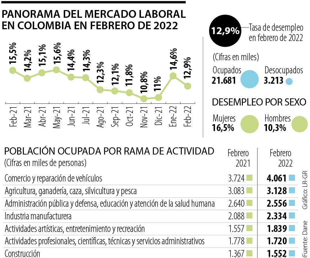 El Departamento Administrativo Nacional de Estadística, (Dane), anunció los resultados más recientes de la tasa de desempleo que comprende el mes de febrero del año en curso. Esta se ubicó en 12,9% en el total nacional y representó una caída de 2,6 puntos porcentuales frente a febrero de 2021 cuando registró 15,5%.