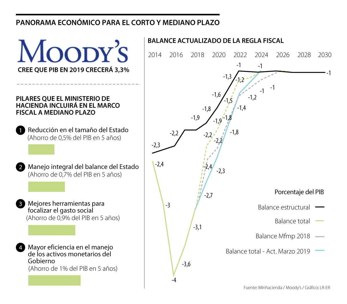 El ministro sostuvo que el plan estructurado para reducir el gasto en los próximos años estará con estos pilares anteriormente señalados. De hecho, señaló que con la reducción del Estado se podrían ver ahorros de 0,5% del PIB en cinco años, mientras que con el manejo integral del balance de las finanzas de la Nación se verán ahorros de 0,7% del PIB.