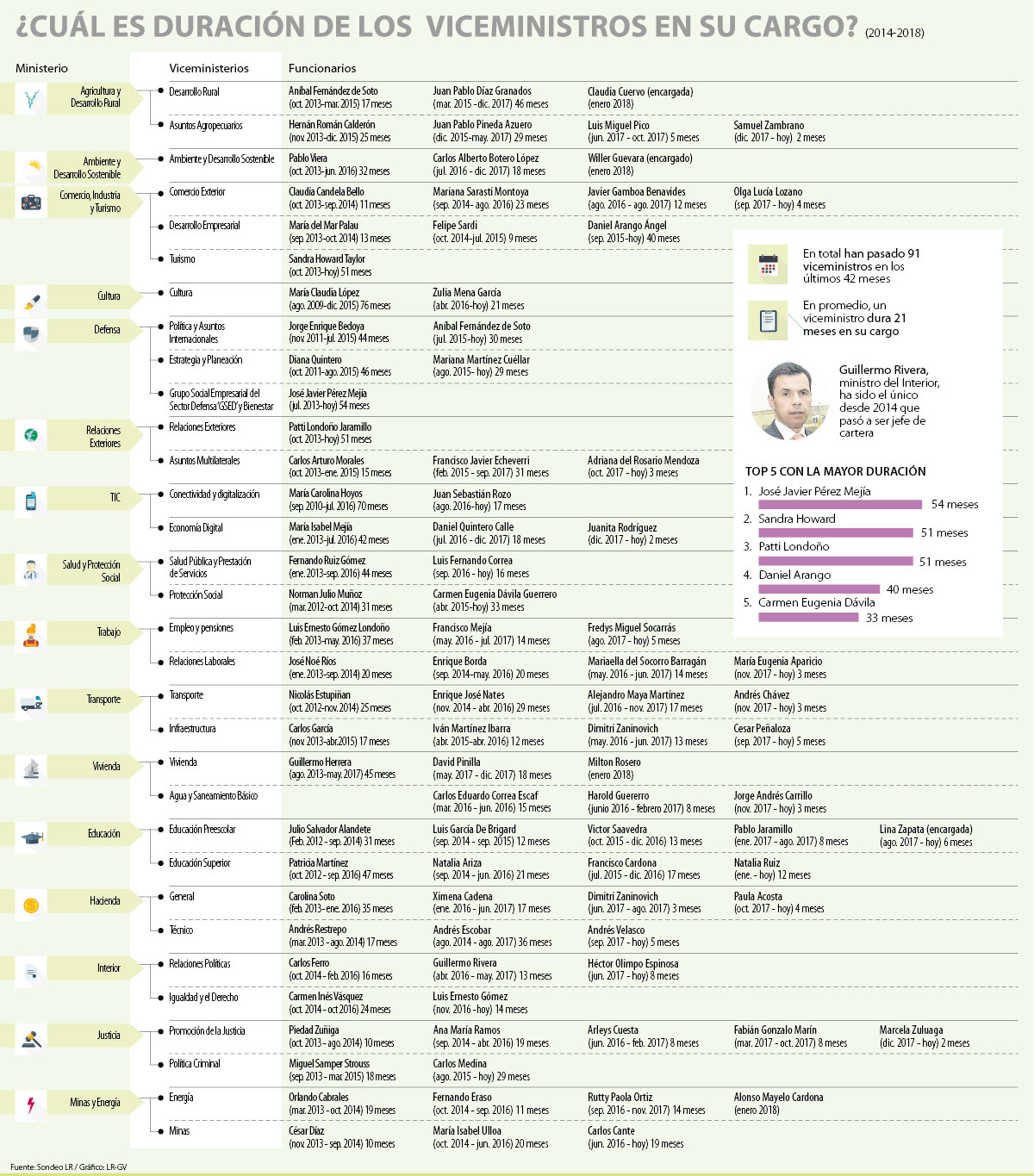 Aunque en promedio, los funcionarios no duran dos años en el cargo, algunos superan esta media. Tal es el caso de José Javier Pérez Mejía, viceministro del Grupo Empresarial y Social del Sector Defensa (Ministerio de Defensa) quien cumple 54 meses como funcionario; Sandra Howard, viceministra de Turismo (Ministerio de Comercio, Industria y Turismo), quien cumple 51 meses en el cargo, y Patti Londoño, viceministra de Relaciones Exteriores, quien también completa el mismo tiempo en su puesto.