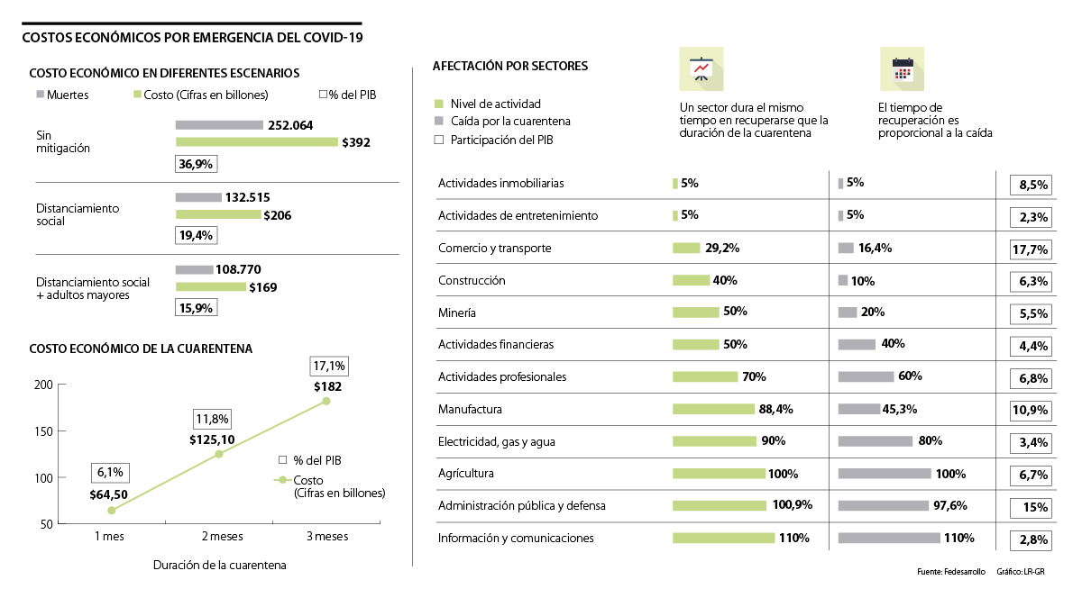 El Centro de Investigaciones Fedesarrollo en cabeza de su director ejecutivo, Luis Fernando Mejía, presentó un estudio en el que, bajo diferentes supuestos, estima los costos en la economía por cada mes de cuarentena. Los cálculos planteados muestran dos escenarios: uno con una operación agregada de 63,3% y otro más pesimista con una operación de 50,8%.