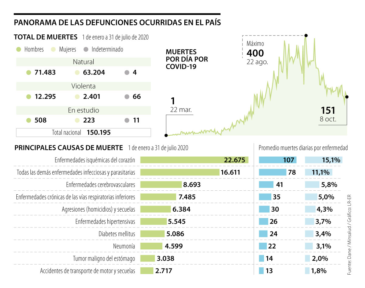 A nivel nacional, entre el 1 de enero y el 31 de julio, según el Dane, el total de muertes en el territorio nacional fue de 150.195, y 134.691 fueron por muerte natural; 14.762 por muerte violenta y 742 están en estudio, lo que se traduce en un promedio diario de 708 muertes sin segmentar por la causa de muerte.