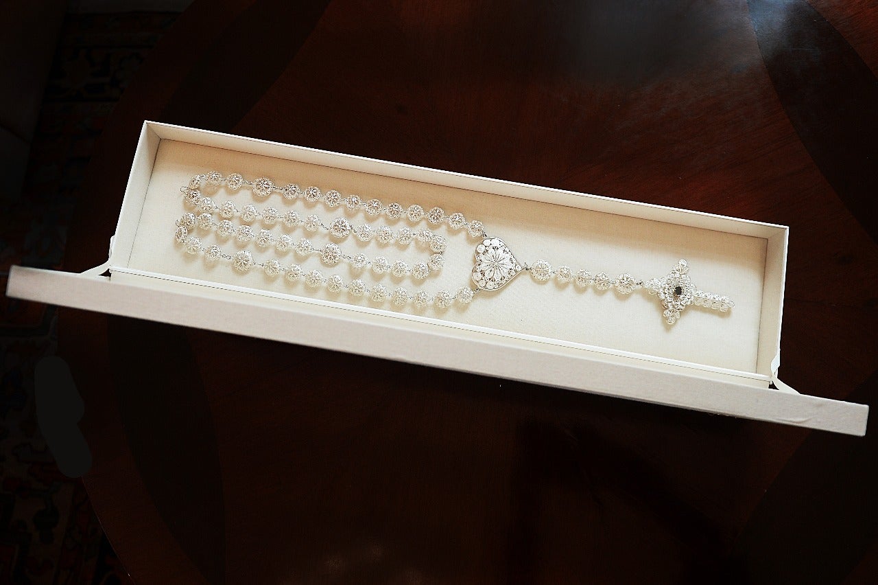 El primero es un rosario en plata de 400 gramos con una incrustación de ónix en la cruz. Su elaboración duró tres meses, es una pieza exclusiva y fue hecha por Diego Urán Arcia, un artesano de la Ciénaga de Oro, Córdoba, que lleva 50 años trabajando en joyería. El rosario fue hecho con la técnica de filigrana, es decir que entrelazan finos hilos de oro y plata que se convierten en un encaje.
