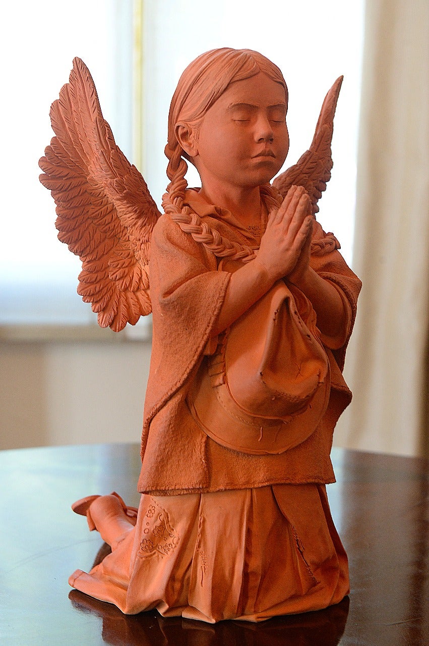 “Está inspirada en la pureza, inocencia y humildad de una niña campesina que, con tristeza, alcanzó a vivir la guerra de los más grandes, pero ora y da gracias a Dios con la fe de que en los días por venir esa palabra ya no exista”, dice el escultor.