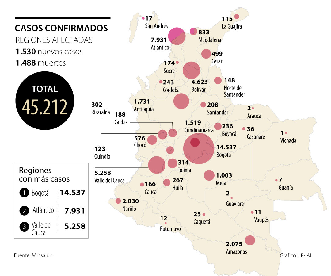 De acuerdo con las más recientes cifras de covid-19, Bogotá, con 14.537 casos es la región más afectada del país.
