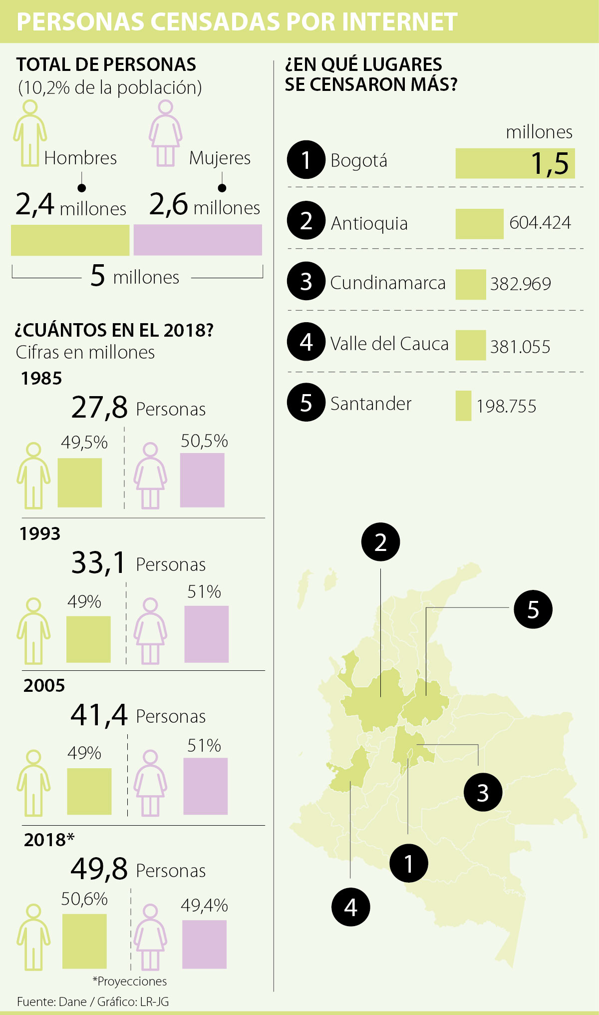 De total de censados de manera electrónica, el Dane indicó que buena parte residen en Bogotá, donde respondieron el cuestionario 1,5 millones de personas. Detrás, le siguieron los departamentos de Antioquia, con 604.424 personas; Cundinamarca, con 382.969; Valle del Cauca, con 381.055 y Santander, con 198.755. Además, destaca que las más activas fueron las mujeres, con 2,6 millones de formularios diligenciados, frente a 2,4 de los hombres.