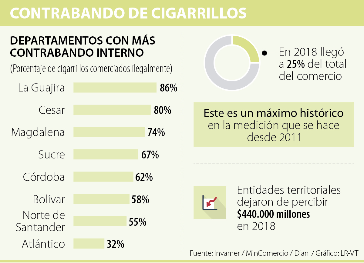 Al revisar los datos de las regiones, en la Costa Caribe se encuentran los departamentos con mayor cantidad de cigarrillos de contrabando. En La Guajira corresponden a 86% del mercado, en Cesar a 80%, en Magdalena a 74% y en Sucre, Córdoba y Bolívar a 67%, 62% y 58% respectivamente.