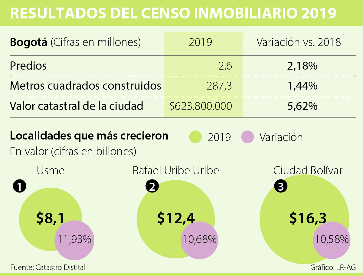 El Catastro Distrital, en cabeza de Olga Lucía López, presentó ayer los resultados de Bogotá Crece: Censo Inmobiliario 2019. El balance reveló que el valor catastral de la capital creció 5,62% y ascendió a $623,8 billones; el número de predios aumentó 2,18% a 2,6 millones; y, los metros cuadrados construidos presentaron un incremento de 1,44%, llegando a 287,3 millones de metros cuadrados.