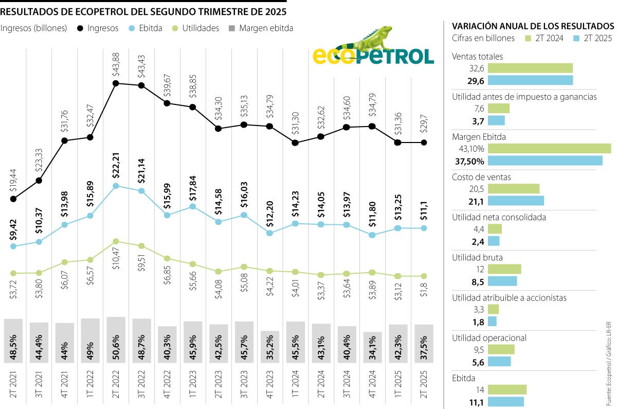 En el desglose de los resultados del cierre del primer semestre del año, la compañía también mostró bajas en el Ebitda, este indicador financiero da cuentas del beneficio; en este caso la estatal petrolera antes de restar los intereses que deben pagar por la deuda contraída, en esta oportunidad, fue de $11,1 billones, mostrando también una caída de 20,8% al cierre del segundo trimestre de 2025, comparándolo con el mismo periodo del año pasado.
