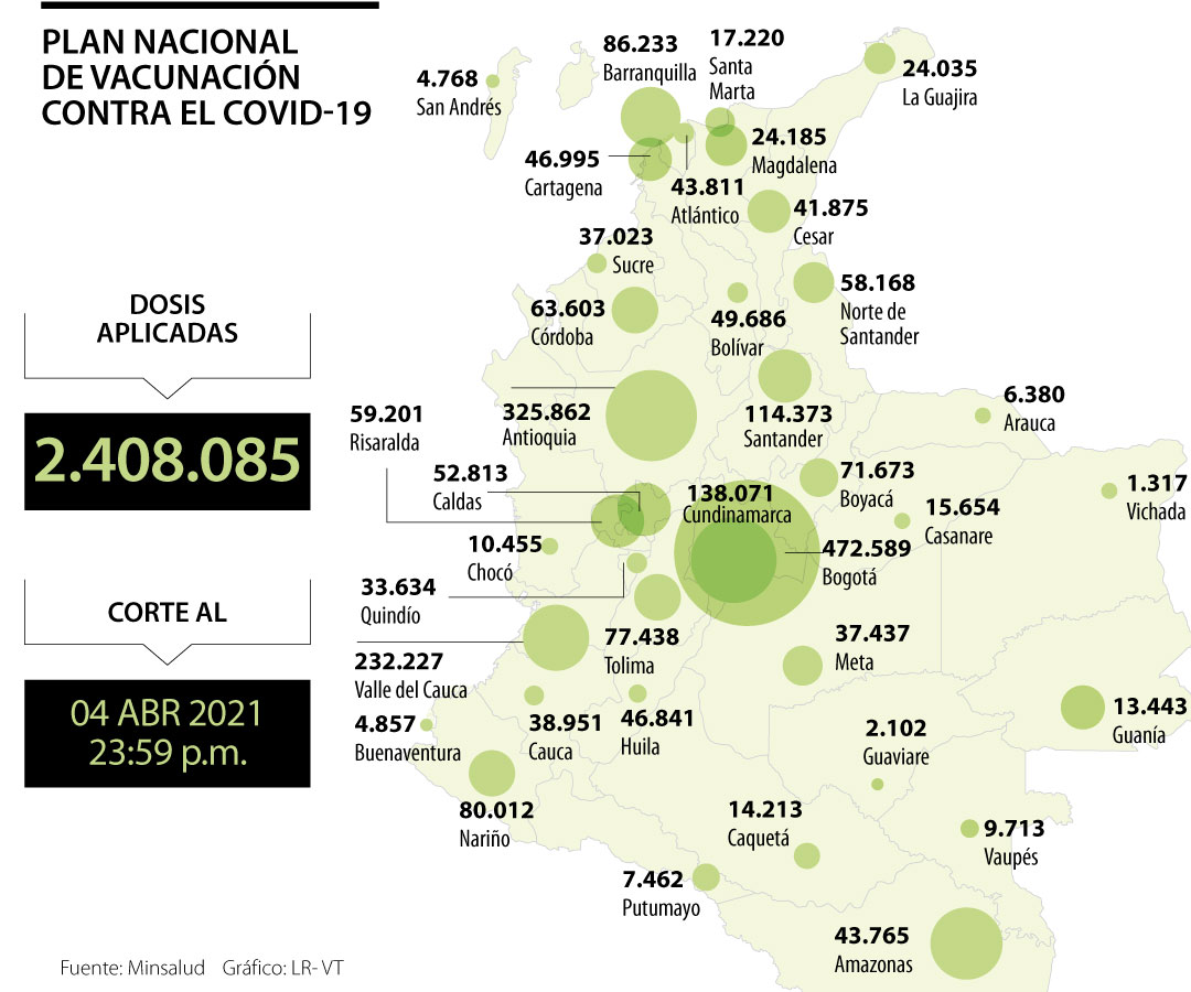 El Ministerio de Salud, bajo la dirección de Fernando Ruiz, reportó que con corte al 5 de abril a las 23:59 p.m se habían aplicado 2.578.601 dosis contra el covid-19 en todo el país, de las cuales 98.930 fueron puesta en la última jornada.