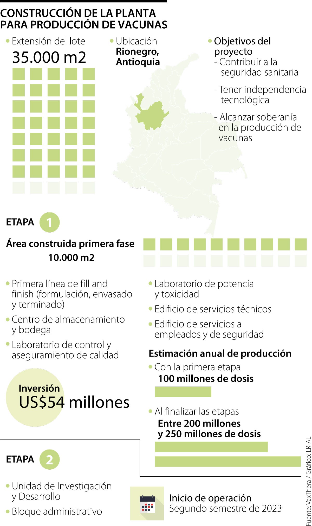 Según explicó Jorge Emilio Osorio, CEO de VaxThera, durante el evento de inauguración, “la construcción de la planta se realizará en dos etapas. La primera albergará el fill and finish, laboratorios de potencia y toxicidad, centros de almacenamiento y edificios de servicios. En la segunda etapa, se integrarán las unidades de producción, el bloque administrativo y la unidad de investigación y desarrollo”. Además, el directivo mencionó que con la primera etapa se estima producir 100 millones de dosis al año, y al terminar la segunda serán entre 200 millones y 250 millones de dosis anuales.